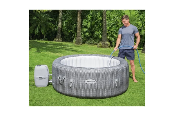 Gerade wenn nach der Sommersaison die Temperaturen fallen, gibt es nichts Angenehmeres! Schalten Sie ab – mit einer bis zu 40°C warmen Sprudelmassage. Der Lay-Z-Spa Honolulu AirJet von Bestway ist Ihre Oase der Entspannung. Als aufblasbarer Whirlpool ist er leicht zu transportieren und einfach zu verstauen. Die 120 AirJet-Düsen bieten eine Sprudelmassage mit extra Luxus-Feeling! Das robuste TriTech-Material hält jeder herkömmlichen Belastung stand und ist in grauer Rattanoptik gehalten.
