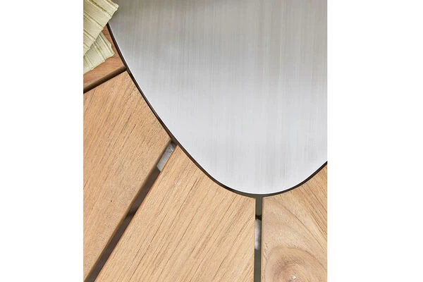 | Design-Highlight Die extra breiten Lamellen aus recyceltem Teakholz verleihen dem Tisch eine exklusive und edle Optik. Durch das moderne Design ist dieser Tisch absolut zeitlos. | |