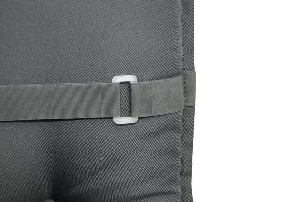 Der Bezug wird aus 100% Polyester (180 g/m²) gefertigt und bietet, dank des klassischen Designs in anthrazit und den ziervollen Steppnähten, ein optisches Highlight für Ihre Sitzmöbel. Durch das Haltegummi an der Rückseite und die Bindekordeln an der Sitzfläche lässt sich die Auflage kinderleicht fixieren und verrutscht nicht so leicht, auch wenn der Stuhl eine glatte Oberfläche besitzt. Dank der Maße von ca. 100 x 50 cm passt sich die Auflage perfekt an die meisten Niederlehner an. Der Komfort kommt selbstverständlich nicht zu kurz – dafür sorgt der weiche, ca. 7 cm starke Kern, bestehend aus einer Schaum- und Polyestervliesfüllung. Ob zum Sonnen oder bei der Familienfeier – diese Auflage macht stets eine gute Figur.