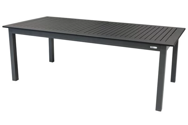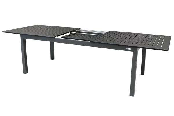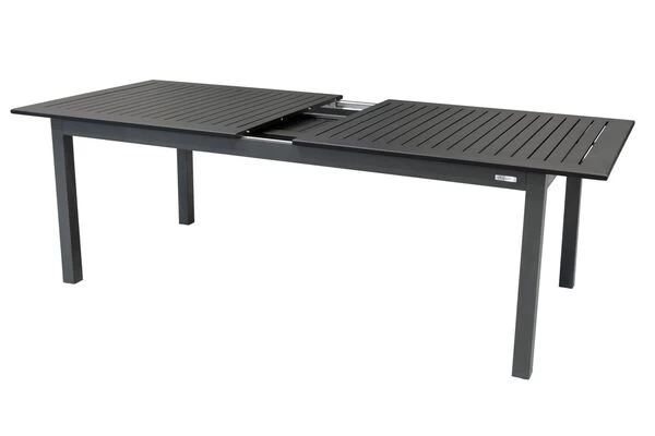 Der praktische Esstisch überzeugt mit hochwertiger Verarbeitung und schlichtem Design. Das Gestell wurde aus pulverbeschichtetem Aluminium in der Farbe anthrazit angefertigt. Aluminium eignet sich dank zahlreicher positiver Eigenschaften ideal für die Herstellung von Outdoor-Möbeln. Sie können den Esstisch unbesorgt das ganze Jahr im Freien stehen lassen. Durch die Pulverbeschichtung wird das Material stoß-, schlag- und kratzfest. Kombiniert wird das Gestell mit einer schwarzen Tischplatte, die ebenfalls aus pulverbeschichtetem Aluminium angefertigt wurde. Die Tischplatte können Sie ganz einfach auf eine Länge von ca. 280 cm ausziehen. Dazu schieben Sie die Tischplatte an beiden Seiten nach außen. In der Mitte können Sie nun das Verlängerungsstück ausklappen und die beiden äußeren Seiten wieder anschieben – perfekt wenn sich spontaner Besuch ankündigt.