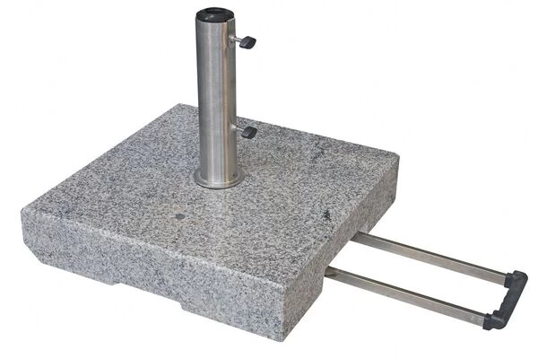 Wer kennt es nicht? Eine starke Windböe, und schon macht man sich Sorgen um den Sonnenschirm. Durch einen Schirmständer kann dies verhindert werden – der Schirm bekommt seine nötige Stabilität und bleibt sowohl im geschlossenen, als auch im geöffneten Zustand genau dort stehen, wo er stehen soll – so steht einer gemütlichen Gartenparty auch bei windigem Wetter nichts mehr im Wege. Der Schirmständer Trolley der Marke Doppler bietet Ihnen dank seines Gewichts von ca. 70 kg nicht nur die nötige Stabilität für Sonnenschirme mit einem Durchmesser von bis zu 350 cm, durch seine Maße von ca. 50 x 50 x 11 cm (ohne Rohr) und dem verwendeten Granit in Verbindung mit Edelstahl passt er sich optisch perfekt an Ihren Garten oder Ihre Terrasse an und ist außerdem absolut wetterfest. Der Ständer ist geeignet für Schirmstöcke mit einem Durchmesser von ca. 32 – 60 mm. Trotz seines Gewichts lässt sich dieser Sockel leicht bewegen, denn er verfügt nicht nur über zwei Rollen, sondern ist auch mit einem ausziehbaren Zuggriff versehen- optimaler Sonnenschutz zu jeder Tageszeit und an jeder Stelle ist also garantiert.