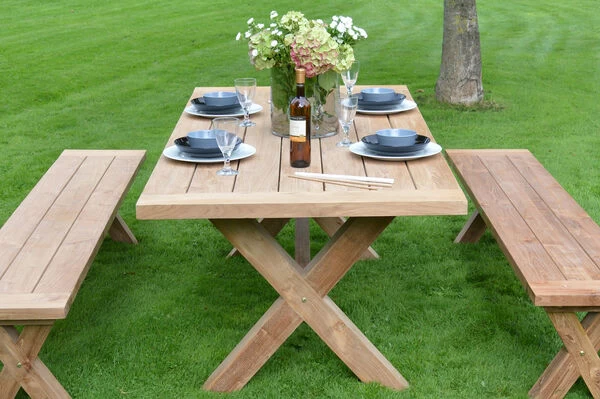 Dieser zeitlose Gartentisch hat Maße von ca. 180 x 100 x 75 cm und bietet so eine ausladende Abstellfläche. Hier können Sie bequem Ihr Mittag- oder Abendessen zu sich nehmen oder zu einem gemütlichen Grillabend laden. Mit einer Stärke von ca. 5 cm hält die Tischplatte eine tägliche Nutzung ohne Probleme aus. Dazu bietet Ihnen der Tisch mit den gekreuzten Beinen auch ein optisches Highlight! Mit einer Unterschubhöhe von ca. 70,5 cm lassen sich so gut wie alle gängigen Gartenstühle unter die Tischplatte schieben.
