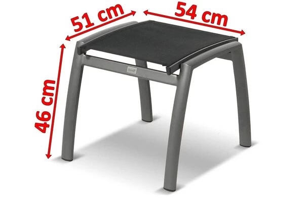 Der Rahmen ist wie bei den Stühlen aus anthrazitfarbenen Aluminium gefertigt und mit strapazierfähigen Textilen ebenfalls in der Farbe Anthrazit kombiniert, was den Hocker gleichermaßen leicht und robust werden lässt – egal ob feuchtes Wetter oder auch einmal ein Stoß, der Hocker verzeiht auch einmal einen ruppigeren Umgang.