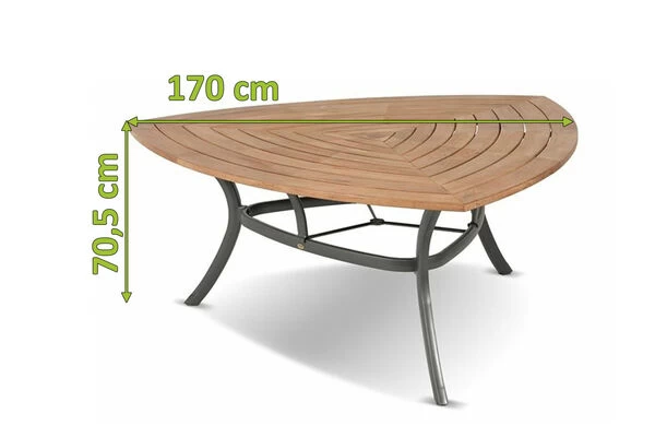 Eine Tischplatte im modernen, dreieckigen Design aus Teakholz in einem natürlichen Braunton aus FSC-zertifiziertem Teakholz in Kombination mit einer dunkelgrauen Aluminiumbasis, die durch ihre 3 Tischbeine, die ideale Ergänzung zu dieser besonderen Tischplatte ist – der Hersteller Hartman bringt mit diesem Produkt einmal mehr einen besonders schicken Tisch in den heimischen Garten. Die hochwertige Materialwahl FSC-zertifiziertem Teakholz aus kontrollierter Fällung und robustem, pulverbeschichtetem Aluminium sorgt nicht nur für eine hochwertige Optik, sondern auch für hohe Stabilität und Langlebigkeit.