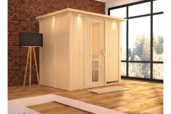 Dank der wärmegedämmten Holztür mit klarem Isolierglas bleibt der Energieverbrauch niedrig. Die im Lieferumfang enthaltenen zwei Liegen aus Espenholz (ca. 57 cm und ca. 27 cm breit), ein Offenschutzgitter und eine Kopfstütze Classic sorgen für mehr Sicherheit und Komfort im Inneren der Sauna.