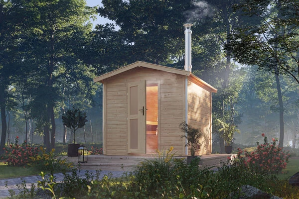 Bei diesem Modell haben Sie die Wahl zwischen einer blickdichten Milchglastür und einer modernen Saunatür mit Klarglas-Lichtausschnitten. Das Saunahaus ist in naturbelassen für die eigene Farbgestaltung erhältlich.