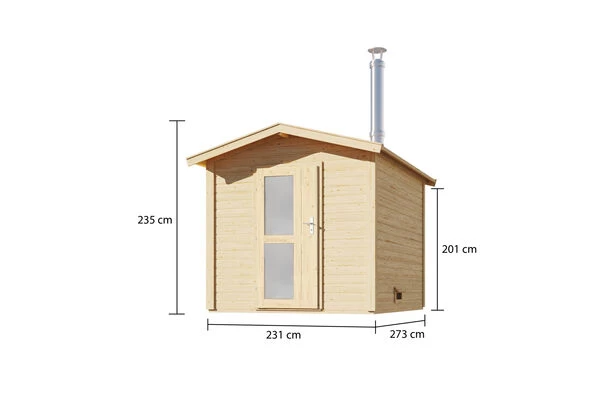 Das Saunahaus Bosse 1 aus nordischer Fichte von KARIBU wird aus 38 mm Wandbrettern im Steck-/Schraubsystem gefertigt und kann somit rasch und einfach aufgebaut werden. Das praktische Satteldach aus Massivholz sorgt dafür, dass das Saunahaus schnell und wirkungsvoll gegen Witterungseinflüsse geschützt ist. Mit ihren Außenmaßen von ca. 231 x 273 x 235 cm und den Innenmaßen von ca. 219 x 261 x 215 cm, einer Grundfläche von 6,11 m² und einem umbauten Raum von 13 m³ bietet diese Sauna für alle Anforderungen ausreichend Platz. Auch der geräumige Vorraum lädt zum geschützten Verweilen und Entspannen zwischen den Saunagängen ein.
