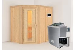 1x KARIBU Carin Sauna, naturbelassen, Fichte, ca. 196 x 151 x 198 cm, Eckeinstieg, mit Energiespartür SET mit Ofen 4,5 kW ext. Strg. Easy