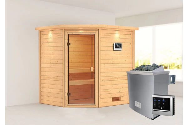 1x KARIBU 38 mm Sauna Elea mit Eckeinstieg, Dachkranz und bronzierter Tür in verschiedenen Ausführungen inkl. Montageanleitung und -material