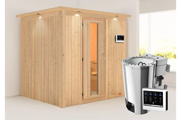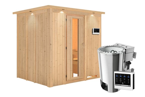 Energiespar-Sauna Eupin aus Fichtenholz mit Fronteinstieg und Dachkranz, naturbelassen in verschiedenen Ausführungen von KARIBU