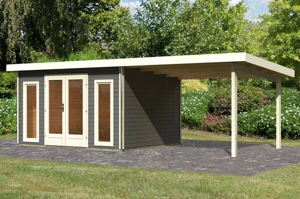 - Artikelbezeichnung: Gartenhaus „Radeburg 2“ SET terragrau mit Anbaudach 3,3 m