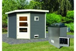 1x KARIBU Heikki Saunahaus, terragrau, Fichte, ca. 231 x 231 x 190 cm, Eckeinstieg, mit moderner Tür SET mit Ofen 9 kW ext. Strg.