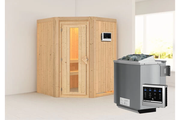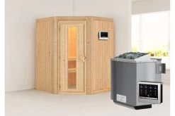 1x KARIBU Larin Sauna, naturbelassen, Fichte, ca. 151 x 151 x 198 cm, Eckeinstieg, mit Energiespartür, SET mit Ofen 4,5 kW Bio ext. Strg.