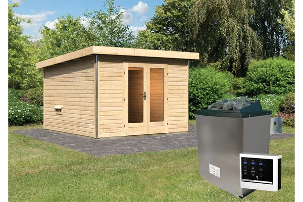 1 x KARIBU Mainburg 1 Saunahaus, naturbelassen, Fichte, 309x309x229 cm, SET B mit Doppelflügeltür, Vorraum und 9 kW Ofen