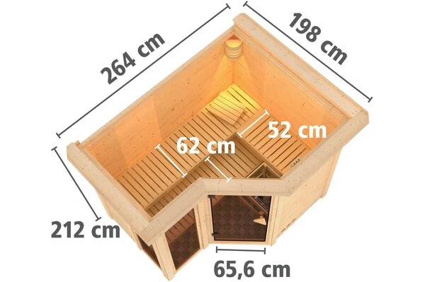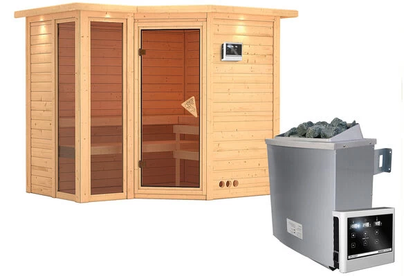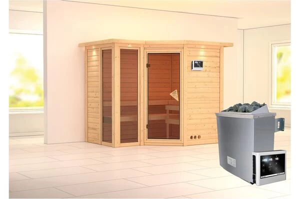 KARIBU Ecksauna Amara mit Eckeinstieg und diversen Ofen-, Steuerung- und Kranzoptionen