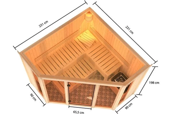 Die Elementsauna von KARIBU bietet dank ihrer Wandstärke von 68 mm und der im Wandelement eingebauten Mineralwolldämmung eine hervorragende Energieeffizienz. Die vorgefertigten Wandelemente, die außen mit Softline-Profilholz verkleidet sind, sind leichter als Holz und haben gleichzeitig einen höheren Dämmwert. Darüber hinaus sind Saunen mit diesem Wandaufbau günstiger als die Produkte aus Vollholz. Durch die formschöne Saunatür gelangen Sie ins Innere der Kabine, welche mit Liegen ausgestattet ist. Die Liegen sind ausreichend breit bemessen und bieten Ihnen die nötige Entspannung. Die Lieferung erfolgt inklusive Ofenschutzgitter.