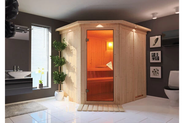 1x KARIBU 68 mm System Sauna Siirin mit Eckeinstieg, bronzierter Glastür und Dachkranz in verschiedenen Ausführungen inkl. Montageanleitung und -material