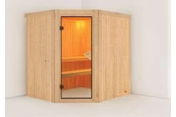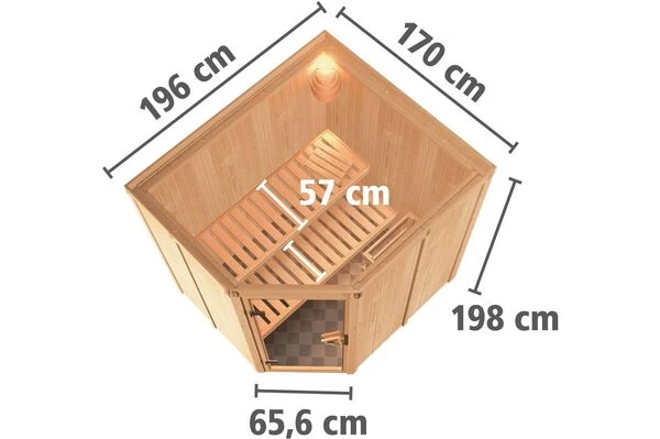 KARIBU Ecksauna Lilja mit Eckeinstieg und diversen Tür-, Ofen-, Steuerung- und Kranzoptionen