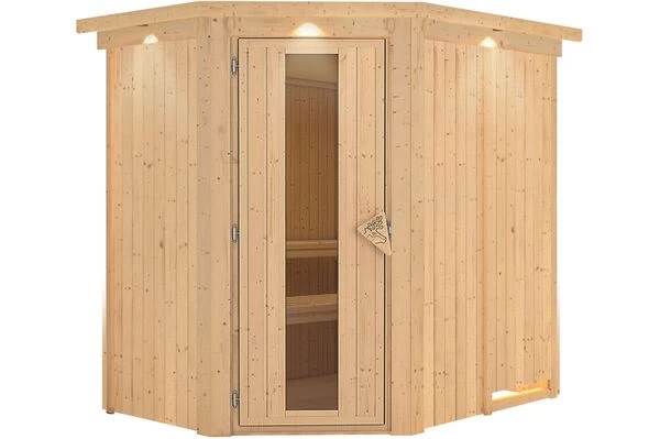 KARIBU Ecksauna Saja mit Eckeinstieg und diversen Tür-, Ofen-, Steuerung- und Kranzoptionen