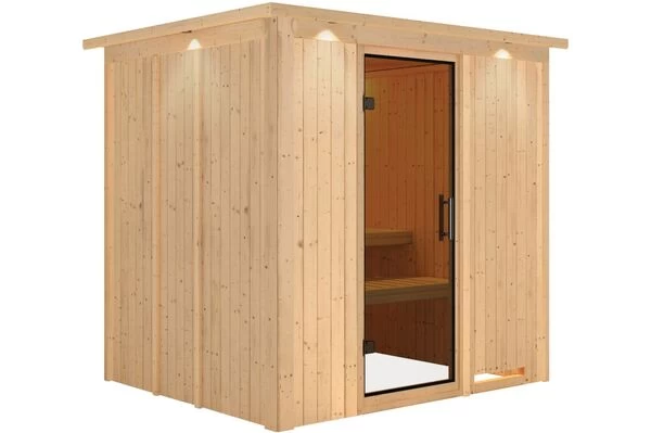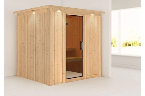 KARIBU Sauna Sodin mit Fronteinstieg und diversen Tür-, Ofen-, Steuerung- und Kranzoptionen
