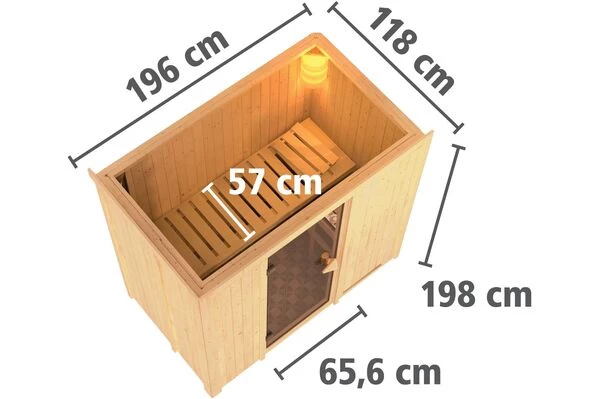Außen befindet sich dann eine stabile Hartfaserplatte. Die Sauna verfügt über einen formschönen und praktischen Fronteinstieg. Mit ihren Außenmaßen von ca. 196 x 118 x 198 cm (mit Kranz ca. 210 x 132 x 202 cm) und den daraus resultierenden Innenmaßen von ca. 181 x 103 x 192 cm bietet diese Sauna für alle Anforderungen ausreichend Platz. Die zwei Liegen werden innen auf Vierkanthölzern montiert, welche aufgrund der Systembauweise in der Höhe nicht flexibel sind. Die untere Liege kann jedoch bei Bedarf platzsparend unter die obere Bank geschoben werden, sodass der Innenraum größer wirkt und sich die Reinigung einfacher gestaltet. Ein Ofenschutzgitter ist stets im Lieferumfang enthalten, ebenso wie einer Bank und eine Kopfstütze, die das Interieur gekonnt abrunden.