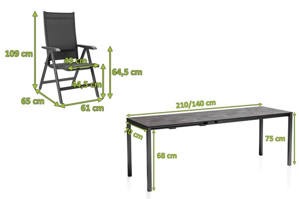 Bei dieser Esstischgruppe treffen hochwertige Materialien und Design auf modernste Weise aufeinander. Das Set besteht aus einem innovativen Ausziehtisch mit den Maßen von ca. 140/210×70 cm und 4 Multipositionssesseln der Marke Kettler aus der Serie „Basic Plus“.