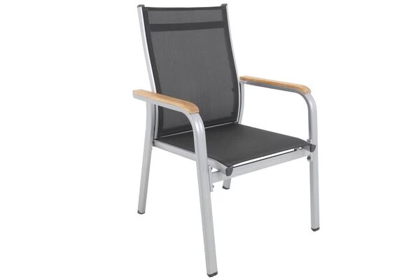 Freuen Sie sich nach einem langen Tag auf Ihre bequemen Sessel. Die Stapelsessel Granada bringen Ihnen die wohlverdiente Erholung in den Alltag. Dank der angenehmen Sitz- und Rückenfläche erhalten Sie einen fühlbar erhöhten Sitzkomfort, der Sie und Ihre Gäste begeistern wird. Für das formschöne und solide Gestell kommt korrosionsbeständiges Aluminium mit Pulverbeschichtung im glanzvollen Silberton zum Einsatz. Die anthrazitfarbene Bespannung der Rücken- und Sitzflächen besteht aus dem innovativen Outdoorgewebe Textilene und sorgt für die nötige Leichtigkeit. Das Material ist sehr hautsympathisch und schenkt ein herrlich luftiges Sitzgefühl, das Sie vor allem in der Sommerhitze schätzen werden. Die Gesamtmaße jedes Sessels liegen bei ca. 68,5 x 65,5 x 98 cm und mit einer Sitzbreite von ca. 49 cm sitzen Sie stets komfortabel. Bei einer Sitzhöhe von ca. 44 cm bieten Ihnen die Sessel auch genügend Beinfreiheit am Tisch. Die schlichten und zugleich markanten Armlehnen aus hautschmeichelndem, natürlichen Teakholz sind ein besonderes Highlight, die den Möbeln natürlichen Komfort und ein individuelles Design schenken. Dank der hohen Qualität und erstklassigen Verarbeitung sind die ca. 5,5 kg leichten Sessel bis zu ca. 120 kg belastbar. Sie können die Sessel somit auch spielend nach der Sonne ausrichten, an Ihren Lieblingsplätzen aufstellen oder in den Schatten bringen. Zur Aufbewahrung stapeln Sie die Sessel einfach bis zum nächsten Einsatz.