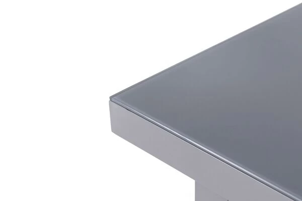 Seine besondere Optik verdankt er der Kombination aus der ca. 5 cm dicken Tischplatte aus Alu/Einscheibensicherheitsglas und dem silberfarbenen Aluminiumgestell. Das ca. 5 mm dicke Sicherheitsglas überzeugt durch seine zahlreichen Vorteile und seine besondere Optik. Die geriffelte Tischplattenoberfläche sorgt dafür, dass das einfallende Licht nicht reflektiert wird und so ein matter Effekt entsteht. Der graue Siebdruck auf der Unterseite der Glasplatte sorgt für die graue Optik der Tischplatte. Das silberfarbene Aluminiumgestell ist so hergestellt worden, dass es perfekt zu den silberfarbenen Sesseln passt und die Artikel zusammen eine solide Esstischgruppe ergeben.