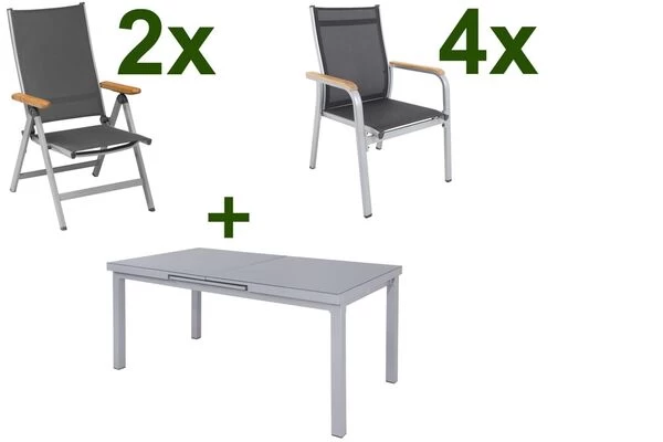 KETTLER Granada Sitzgruppe, silber, Alu/Textilene, OUTFLEXX Premium Premium Ausziehtisch 180/240x100cm, 4 Stapel-, 2 Multipositionssessel