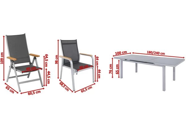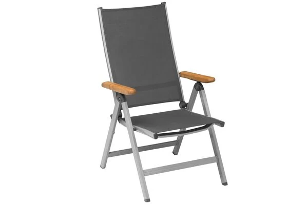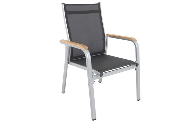 Die Sessel bestechen durch ihre schlichte Optik mit dem pulverbeschichteten Aluminiumrahmen in einem schönen Silber in Kombination mit dem anthrazitfarbenen Textilen-Gewebe. Ergänzt wird dieses zeitlose Design durch FSC-zertifizierte Teakholz-Armlehnen. Funktional überzeugen hier sowohl die Hochlehner, als auch die Stapelsessel. Die Rückenlehne der Hochlehner lässt sich kinderleicht mehrfach verstellen und bietet damit einen hervorragenden Sitzkomfort. Dank des pulverbeschichteten Aluminiumgestells sind alle Sessel zudem leicht und einfach zu transportieren. Je nach Bedarf können die Hochlehner zusammengeklappt und die Stapelsessel ineinander gestapelt, und somit platzsparend verstaut werden.