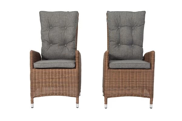 Dieser gemütliche Diningsessel ist wahrlich ein Verwandlungskünstler. Hier können Sie gemütlich mit einem guten Buch in der Sonne liegen oder aber auch ganz bequem Ihr Mittag- oder Abendessen zu sich nehmen. Hierzu brauchen Sie einfach nur Platz zu nehmen und sich Ihren Lieblingssessel problemlos in eine bequeme Liege- oder Sitzposition einstellen. Dies gelingt kinderleicht dank der integrierten Gasdruckfeder – die Rückenlehne kann mit einem kleinen Hebel an der Seite stufenlos verstellt werden. Der Sessel hat ein Gesamtmaß von ca. 65 x 55 x 112 cm. Die Sitzfläche ist ca. 50 cm tief, die Sitzhöhe mit Kissen liegt bei ca. 46 cm. Die Armlehnen mit einer Höhe von ca. 66 cm sorgen bei diesem Sessel für besonderen Komfort. Der Sessel wird im praktischen 2er Set angeliefert. Die maximale Belastbarkeit liegt bei ca. 135 kg.