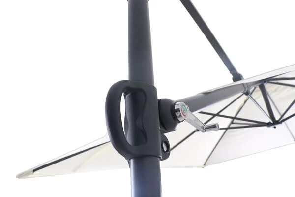 | Kurbelsystem Mit der im Griffteil eingearbeiteten Kurbelmechanik können Sie den Schirm ganz einfach öffnen und schließen. Des Weiteren können Sie hiermit die Dachneigung komfortabel einstellen. | |