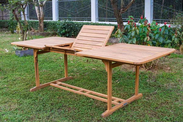Der Ausziehtisch lässt sich ganz einfach durch einen genialen Flügelmechanismus ein- und wieder ausklappen. Die Tischplatte ist an beiden Seiten mit einem kleinen Pin unter der Tischplatte fixiert. Dieser Pin wird zunächst an beiden Seiten gelöst. So kann die Hälfte der Tischplatte nach links und die andere Hälfte nach rechts gezogen werden. Anschließend klappt man die darunterliegende Tischplatte hoch und auseinander. Zum Schluss werden die äußeren Teile der Tischplatte an die Mitte rangeschoben und wieder mit dem Pin unter dem Tisch fixiert. Der Tisch wiegt ca. 29,5 kg und die Tischplatte weist neben einem neuen Design, eine verbesserte Stabilität auf. Die Tischplatte wurde aus aus FSC-zertifiziertem Akazienholz gefertigt. Die FSC-Zertifizierung garantiert Ihnen, dass dieses Möbelstück aus verantwortungsvollen Quellen stammt, sodass Sie sich guten Gewissens zurücklehnen und Ihren neuen Esstisch so richtig genießen können. Das hochwertige Akazienholz für den Outflexx Ausziehtisch hält nicht nur den strengen FSC-Zertifizierungsrichtlinien stand, sondern zeichnet sich außerdem durch seine extrem gute Witterungsbeständigkeit aus. Zudem besitzt Akazienholz eine besonders hohe Härte und Festigkeit – selbst Eichenholz kann da nicht mehr mithalten! Aufgrund der Vielzahl an positiven Eigenschaften ist der Outflexx Ausziehtisch perfekt für den Einsatz im Außenbereich geeignet. Das Akazienholz wurde zum Schutz vor Austrocknung und Witterungseinflüssen geölt. Um einen dauerhaften Schutz vor Verfall zu gewährleisten und zusätzlich die schöne Farbe der Holzmaserung zu erhalten, empfehlen wir Ihnen, die Holzoberfläche regelmäßig mit entsprechenden Pflegemitteln zu behandeln. Dafür ist spezielles Holzöl und Hartwachs bestens geeignet – mit diesem einfachen Trick werden Sie viele Jahre Freude an dem Outflexx Ausziehtisch haben. Dabei ist zu beachten, dass das Holz durch regelmäßiges ölen nachdunkeln kann.