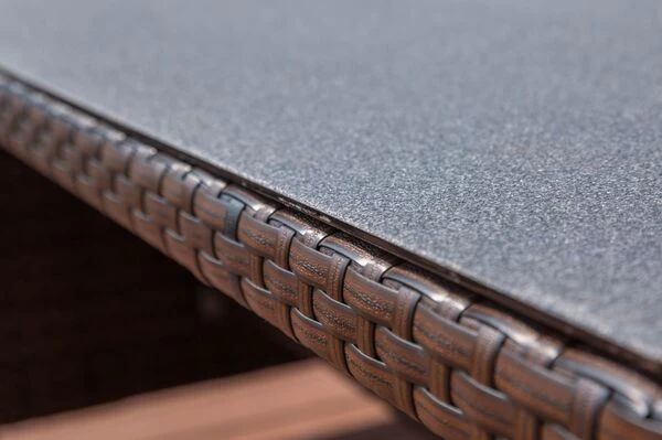 Das Untergestell des Möbelstücks besteht aus pulverbeschichtetem Aluminium, dies macht es nicht nur stabil, sondern sorgt auch dafür, dass es sich aufgrund des relativ geringen Gewichts von ca. 44 kg leicht hin und her stellen lässt. Das Aluminiumgestell wird mit Polyrattangeflecht bespannt. Das flache Geflecht ist in der Farbe braun marmoriert (Faser w37) gehalten und passt so wunderbar zu allen möglichen Terrasseneinrichtungen.