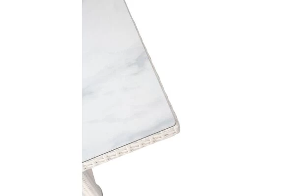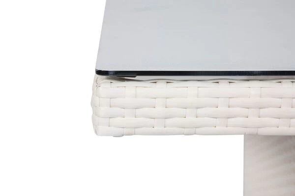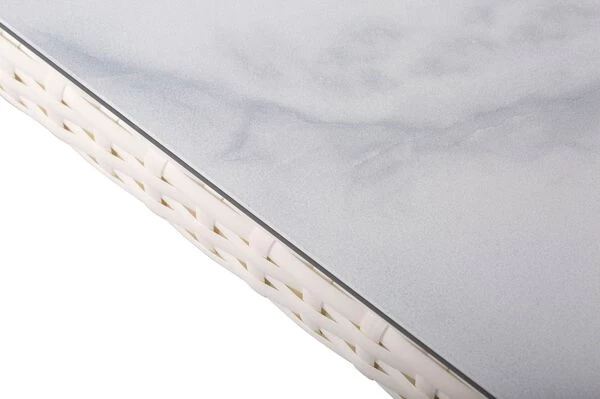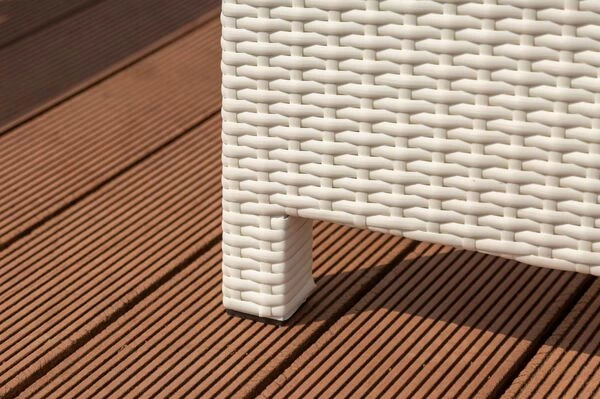 Das Untergestell des Möbelstücks besteht aus pulverbeschichtetem Aluminium, dies macht es nicht nur stabil, sondern sorgt auch dafür, dass es sich aufgrund des relativ geringen Gewichts von ca. 42,8 kg leicht hin und her stellen lässt. Das Aluminiumgestell wird mit Polyrattangeflecht bespannt. Das flache Geflecht ist in der Farbe weiß (Faser w29) gehalten und passt so wunderbar zu allen möglichen Terrasseneinrichtungen.