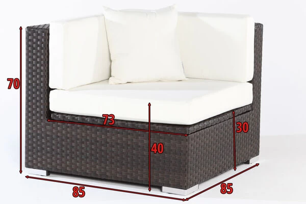 Ob als Bestandteil einer Gartenlounge oder als Balkonmöbel: Dieses Modulelement bietet Ihnen die beste Grundlage für Ihre individuelle Gartengestaltung. Das Eckelement ist absolut wetterfest und äußerst pflegeleicht. Extreme Temperaturen zwischen -60°C und +70°C können der flachen Polyrattanfaser nichts anhaben. Das einsitzige Eckelement verfügt über edle Aluminiumfüße, die dank der Kunststoffnoppen Ihren Bodenbelag schonen und einen schönen Kontrast zur Polyrattanfaser bilden. Dieses Eckelement bietet Ihnen mit seiner bequemen Polsterung besten Komfort, um stundenlang relaxen zu können. Die Sitzfläche lässt sich hochklappen. Der Stauraum darunter ist mit einer wasserdichten Kissentasche ausgestattet, die mittels Reißverschluss geschlossen wird. Alle Polster lassen sich so sicher und problemlos verstauen. Das Eckelement ist jeweils mit bis zu ca. 150 kg belastbar. Einzelne Modulelemente bieten zudem den praktischen Vorteil, Ihre Gartenlounge bei Bedarf zu erweitern und immer wieder neu anzuordnen.