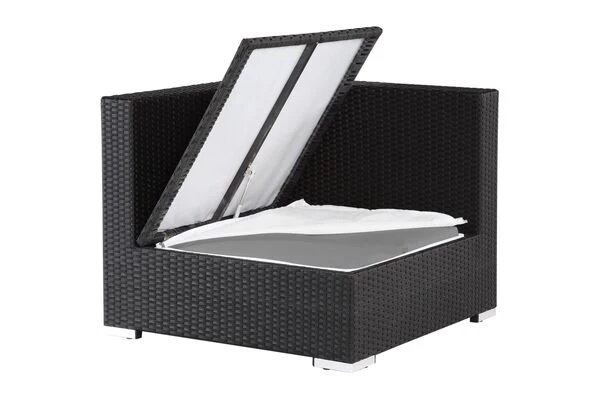 OUTFLEXX® ModulelementeLine: Polyrattan Eckelement mit Kissenboxfunktion in schwarz