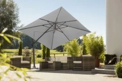 Das OUTFLEXX® Ersatztextil für den quadratischen Ampelschirm mit Maßen von ca. 350 x 350 cm ermöglicht ein neues Bespannen des Schirmdachs. Das Gewebe bietet Ihnen einen UV-Schutz von 80+, ist wasserabweisend imprägniert und besteht aus 100 % Polyester (250 g/m²) in der Farbe Anthrazit. Nicht nur die verwendeten Materialien machen dieses Ersatzdach zu einer guten Wahl, auch die erstklassige Verarbeitung werden Sie zu schätzen wissen.