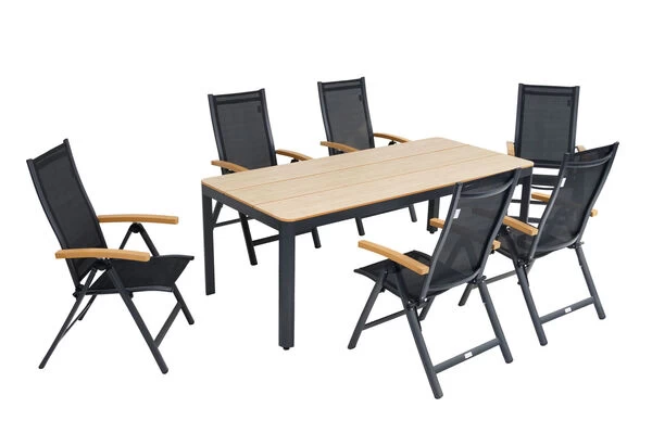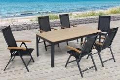 Das Set besteht aus einem Esstisch und 6 dazu perfekt harmonierenden Multipositionssesseln. Sein moderne Flair fügt sich sowohl im Garten, auf dem Balkon oder auch im Haus perfekt ein. Freuen Sie sich darauf nach einem leckeren, gemeinsamen Essen in die komfortable Liegeposition zu wechseln und bei einem Nickerchen den Alltag in weite Ferne rücken zu lassen. Die Multipositionssessel sind luftig leicht und doch stabil. Für das schicke und solide Gestell kommt korrosionsbeständiges Aluminium zum Einsatz. Bespannt wird das solide Gestell mit Textilene im passenden Schwarzton. Es ist unglaublich hautsympathisch und sorgt für ein herrlich luftiges Sitzgefühl, das Sie auch in der Sommerhitze nicht im Stich lässt. Die Gesamtmaße des Sessels liegen bei ca. 67 x 58 x 107 cm. Mit einer einer Sitztiefe von ca. 43 cm sitzen Sie stets komfortabel. Das Holzimitat schafft Ihnen so die Optik von Holz, hat aber den geringen Pflegeaufwand von Kunststoff und ist zudem wetterfest. Dank der hohen Qualität und erstklassigen Verarbeitung ist der ca. 5,05 kg leichte Sessel bis zu ca. 120 kg belastbar. Die Rückenlehne lässt sich ganz leicht 7-fach bis in die waagerechte Position verstellen und ermöglicht Ihnen somit vollste Entschleunigung. So können Sie spielend von einer Liege- in eine Sitzposition und wieder zurück wechseln, ganz nach Bedarf und Komfortwunsch. Das offene Design der Rückenflächen werden Sie besonders bei warmen Temperaturen zu schätzen wissen. Genießen Sie das hervorragende Sitz- und Liegegefühl Ihrer neuen Sitzmöbel! Zur Aufbewahrung können die Sessel einfach platzsparend in Ihrer Garage oder Ihrem Gartenhäuschen zusammengeklappt werden.