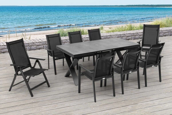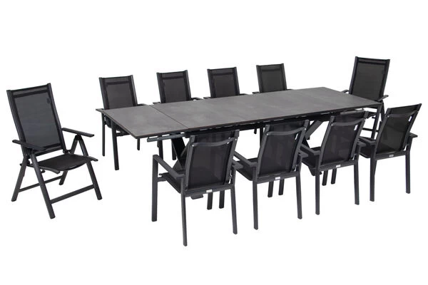 OUTFLEXX® Esstischgarnitur mit Ausziehtisch 180/280x100cm und 10 Stapel-/Multipositionssesseln aus Aluminium/HPL/Textilene in schwarz