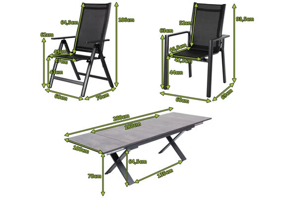 Der ca. 49,4 kg schwere Tisch mit Gesamtmaßen von ca. 180/280 x 100 x 78 cm ist äußerst stabil und mit seinem X-Gestell auch sehr standhaft. Innovative Materialien verleihen ihm seinen besonderen Look: die ca. 6 mm dicke graufarbene Tischplattenoberfläche wird aus HPL (High-Pressure Laminat) gefertigt und überzeugt durch eine einmalige Optik. Das Material besteht aus vielen Schichten Harz und Papier, die unter hohem Druck zusammengepresst werden, so dass eine robuste glatte Oberfläche entsteht. Sie harmoniert perfekt mit dem modernen Gestell. Die Tischbeine haben längs einen Abstand von ca. 135 cm und die Höhe bis zur Tischunterkante beträgt ca. 64,5 cm. Alle Gestelle sind solide gearbeitet und bestehen aus korrosionsbeständigem Aluminium im schicken “anthrazit matt”. Die Sitz- und Rückenflächen der Sessel sind mit Textilene im passenden Schwarzton bespannt. Das Material ist unglaublich hautsympathisch und sorgt für ein herrlich luftiges Sitzgefühl, das Sie auch in der Sommerhitze nicht im Stich lässt. Designstarke Armlehnen schenken den Sesseln erhöhten Komfort. Die Gesamtmaße der Stapelsessel liegen jeweils bei ca. 60 x 69 x 93,5 cm mit einem Gewicht von ca. 3,2 kg. Die Multipositionssessel wiegen jeweils ca. 5 kg bei Maßen von ca. 60 x 70 x 106 cm. Alle Sessel sind dank der hohen Qualität und erstklassigen Verarbeitung bis ca. 130 kg belastbar. Natürlich können Sie die Sitzmöbel auch kinderleicht stapeln oder zusammenklappen und bis zum nächsten Einsatz verstauen.