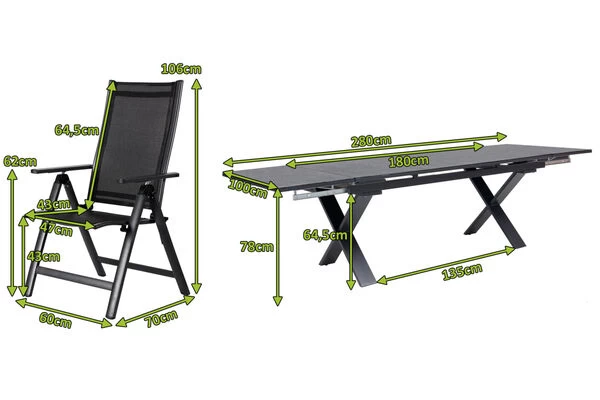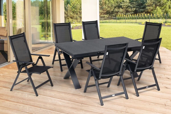 7-teilige Esstischgarnitur von OUTFLEXX® mit Ausziehtisch 180/280x100cm und 6 Multipositionssesseln aus Aluminium/Textilene in schwarz