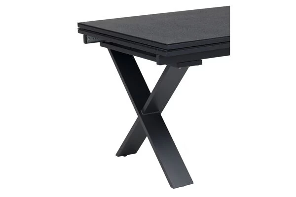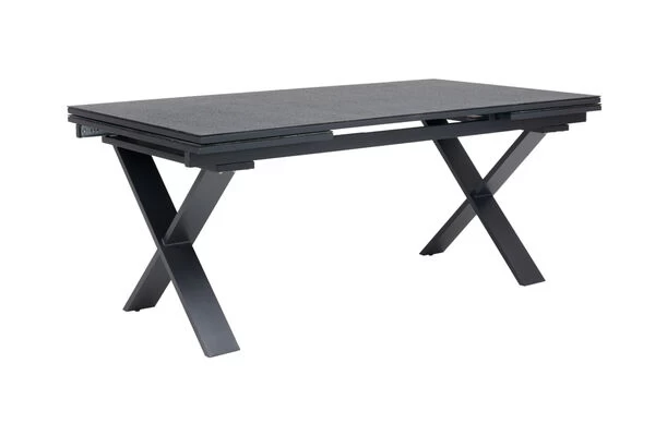Modern und flexibel präsentiert sich der Tisch mit einer Tischplattenlänge von ca. 180 cm. Diese verlängern Sie ganz leicht in sekundenschnelle: je nachdem, ob Sie eine oder beide Verlängerungsplatten ausziehen, vergrößert sich die Gesamtlänge auf maximal ca. 280 cm – ideal für 10 Personen. Ziehen Sie einfach an einer der beiden Verlängerungen, die sich jeweils unter einem Tischende befindet. Jede Platte lässt sich so leichtgängig wie eine Schublade einzeln ausfahren und wird anschließend automatisch in der richtigen Höhe an die Tischplatte gedrückt. Fertig! Bei Bedarf können Sie die andere Seite ebenfalls ausziehen. Der besondere Clou: Sie können ihn sogar gedeckt verlängern, so finden auch spontane Gäste ganz schnell Anschluss. Verkleinert wird der Tisch genauso mühelos. Der ca. 59,25 kg schwere Tisch ist äußerst stabil und mit seinem gekreuzten Gestell aus pulverbeschichtetem Aluminium in der Farbe “anthrazit matt” auch sehr standhaft. Seine Tischbeine haben längs einen Abstand von ca. 135 cm und die Höhe bis zur Tischunterkante beträgt ca. 64,5 cm. Die anthrazitfarbene, rechteckige Tischplatte aus Sicherheitsglas mit Spraystone Finish ergänzt das Tischgestell perfekt und verleiht dem Tisch seine besondere Optik. Ganz gleich, was Sie vorhaben – ob ein gemeinsames Kaffeekränzchen, ein Brunch oder auch ein gemütlicher Spieleabend – der elegante, rechteckige Tisch bietet Ihnen immer das passende Ambiente.