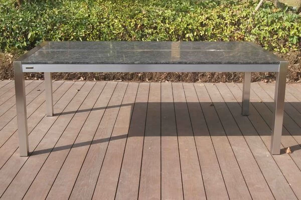 Der Tisch mit Maßen von ca. 200 x 100 x 74,8 cm und einer Tischunterkantenhöhe von ca. 73 cm bietet der Esstisch ausreichend Platz für 6-8 Personen. Seine besondere Optik verdankt der Tisch seinem exklusiven sternförmigen Gestell und einer Tischplatte aus einzigartigem Granit. Die Oberfläche der ca. 1,8 cm starken Platte in der Farbe „graphit glänzend“ ist versiegelt und bietet Ihnen die Möglichkeit auch warme Speisen direkt darauf abzustellen. Der mächtige Tisch bringt insgesamt ca. 132 kg auf die Waage ohne an Eleganz einzubüßen: das Tischgestell wiegt ca. 12 kg und die passende Tischplatte ca. 120 kg. Der Esstisch ist äußerst stabil und kann bis zu ca. 150 kg Gewicht tragen. Seine belastbaren ca. 7,5 x 4,5 cm dicken Tischbeine haben längs einen Abstand von ca. 128 cm. Das harmonische Zusammenspiel der designstarken Tischoberfläche und dem modern gestalteten X-Gestell aus Edelstahl im natürlichen, kühl-glänzenden Silberton, verleiht dem Tisch sein unnachahmliches Aussehen: machen Sie diese exklusive Tafel zum Kernstück Ihres Outdoor-Bereiches.