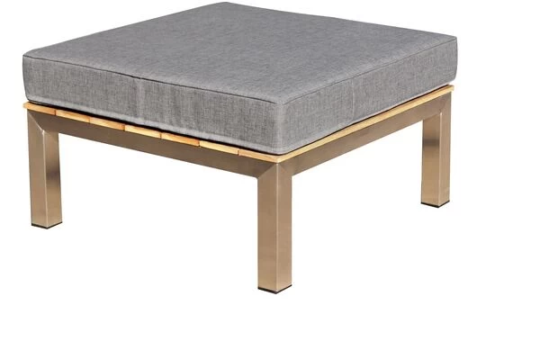 OUTFLEXX® Hocker aus gebürstetem Edelstahl und FSC-zertifiziertem Teakholz mit grauem Polster aus Olefin
