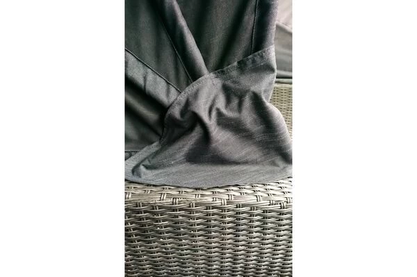 An sonnigen Tagen verwenden Sie einfach das Sonnenschutzdach, das schnell aufzustellen ist und mit Knebelknopf am Grundgestell sicher fixiert werden kann – so spendet es Ihnen angenehmen Schatten und schützt außerdem vor Wind oder unerwünschten Blicken. Der Bügel lässt sich auch gut unter dem Dachbezug verstecken. Da nicht immer die Sonne scheint, sorgt die Wetterbeständigkeit und Pflegeleichtigkeit des Materials für den nötigen Schutz. Die synthetische Faser Olefin wird für ihre Hitzebeständigkeit und optimalen Trage- und Pflegeeigenschaften geschätzt. Polyrattan ist ebenfalls eine wetterfeste Faser, die besonders widerstandsfähig gegen Umwelteinflüsse ist und wird perfekt durch das Gestell aus pulverbeschichtetem Aluminium ergänzt.