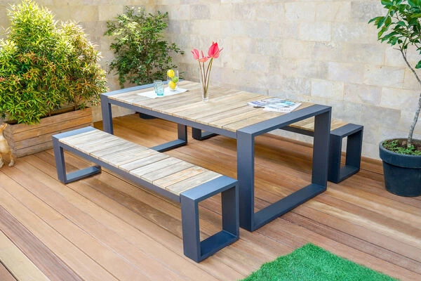 OUTFLEXX® Esstischgarnitur aus Aluminium und recyceltem Teakholz