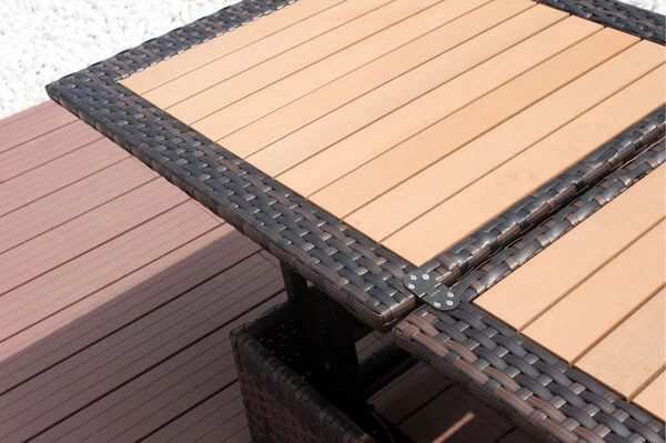 Das Aluminiumgestell dieses Tisches ist mit der braun marmorierten, flachen Polyrattanfaser umflochten. Die Tischplatte besteht aus Kunststofflatten in Holzoptik, diese verleihen dem Tisch einen edlen Charakter und sind zudem besonders pflegeleicht. Der Clou ist jedoch, dass sich der Tisch ganz einfach vergrößern und in Esstischhöhe einstellen lässt. Einfach die Tischplatte aufklappen und das Scherengestell hochziehen – schon können Sie mit vier Personen an diesem Tisch in bequemer Höhe tafeln. Aufgeklappt hat der Tisch eine Höhe von ca. 64,5 cm und eine Länge von ca. 152 cm. Zur Rückverwandlung schieben Sie einfach die Einrasthebel zurück, so dass sich das Gestell einfach zusammenklappen lässt. Zum Schutz vor starken Witterungseinflüssen ist im Lieferumfang dieses Tisches eine hochwertige Abdeckhaube enthalten.