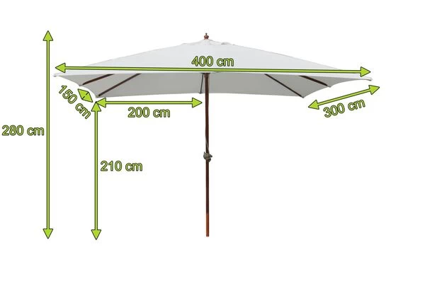Dieser rechteckige Mittelstockschirm von OUTFLEXX ist dank seiner Maße von ca. 300 x 400 cm perfekt für Ihre Terrasse oder den Garten geeignet. Bei einer Gesamthöhe von ca. 280 cm und der Durchgangshöhe von ca. 210 cm kann man bequem unter dem Schirm stehen, zum Beispiel bei Ihrer nächsten Gartenparty.