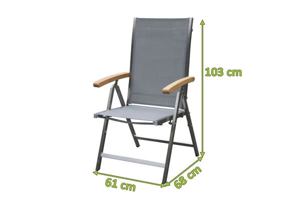Dieser Multipositionssessel ist nicht nur ein Highlight in Sachen Optik, sondern weiß auch durch seinen Komfort und durch seine qualitative Verarbeitung zu überzeugen. Für ein komfortables Sitzen sorgt die hochwertige textilene Bespannung (70% Polyvinylchlorid und 30% Polyester), die den Multipositionssessel auch ohne Auflagen äußerst bequem macht. Außerdem ist er mittels Rasterschiene 4-fach verstellbar, sodass der Sessel je nach Bedarf in eine Sitz- oder Liegeposition gebracht werden kann. Das zeitlose Design aus einem rostfreien Edelstahlgestell mit einer Textilenbespannung in der Farbe silber, macht den Sessel zu einem optischen Highlight für jede Terrasse. Armlehnen aus Teakholz ergänzen das edle Design. Dank der verwendeten Materialien hat dieser Multipositionssessel das sehr geringe Eigengewicht von ca. 9 kg, wodurch er leicht zu handhaben ist und bei Bedarf schnell und einfach zusammengeklappt und platzsparend verstaut werden kann.